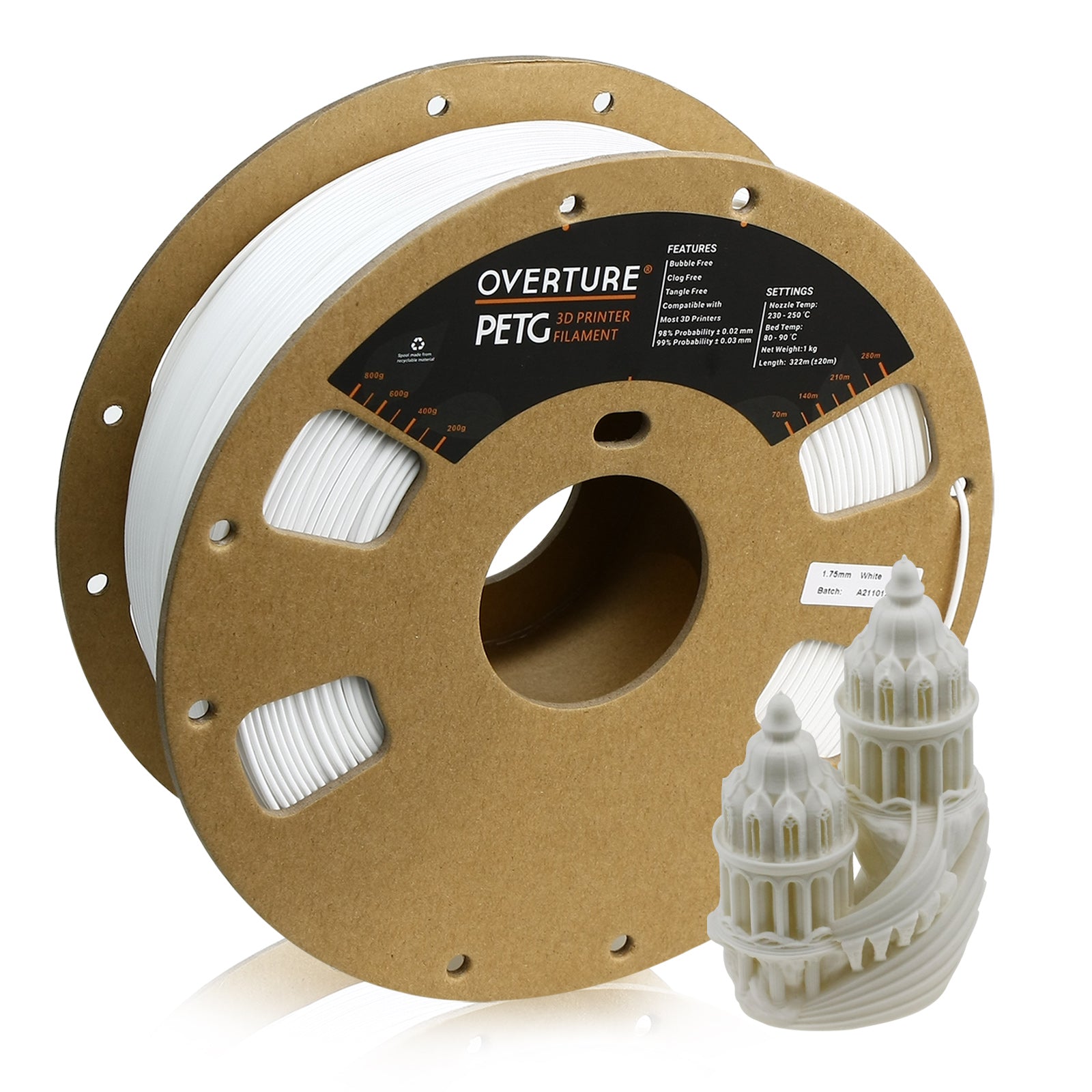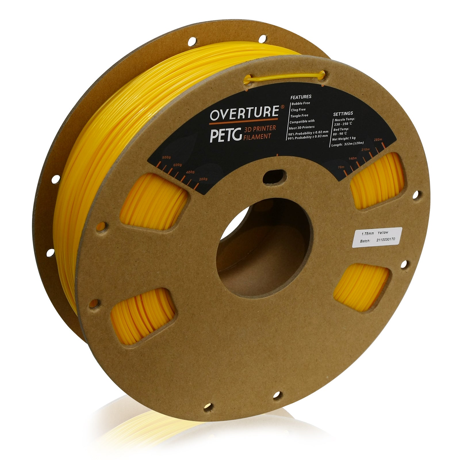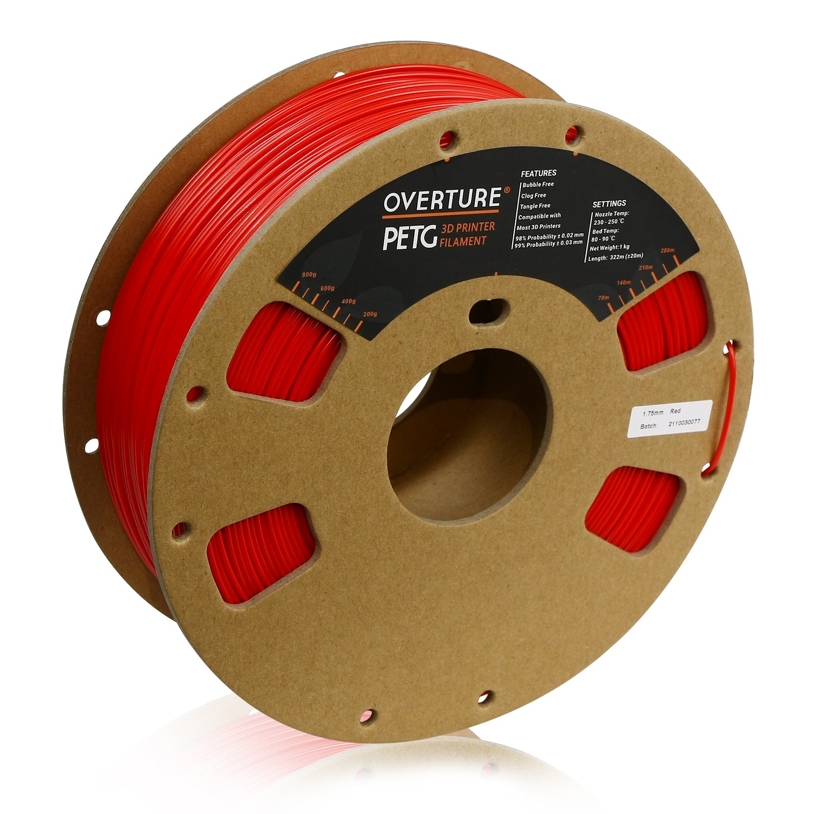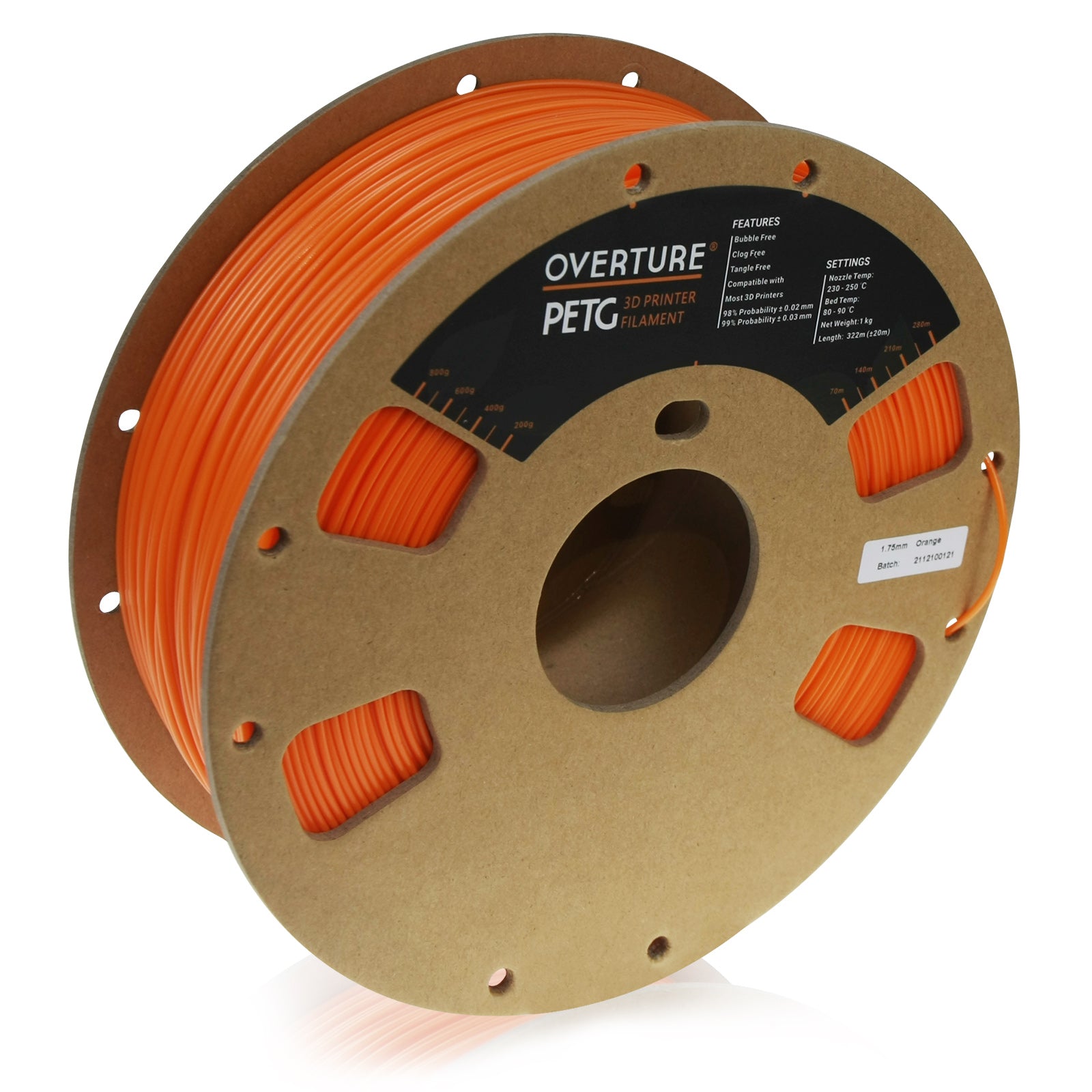 Overture PETG filaments are made of premium PETG resin which combines the advantages of PLA and ABS such as odorless, esay-to-print, little shrinkage rate; Outstanding toughness and high impact strength; Good liquidity (flows smoothly); High mechanical strength and excellent flexibility