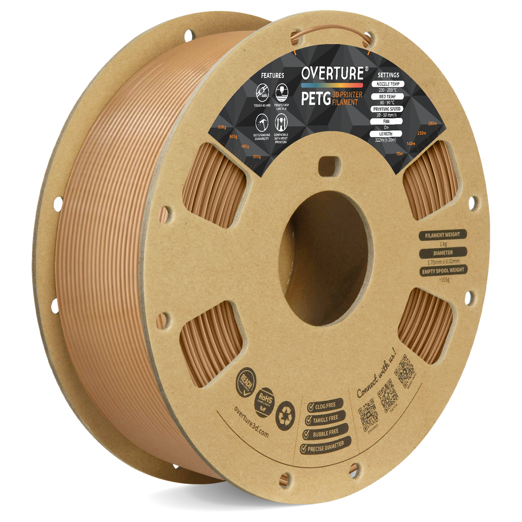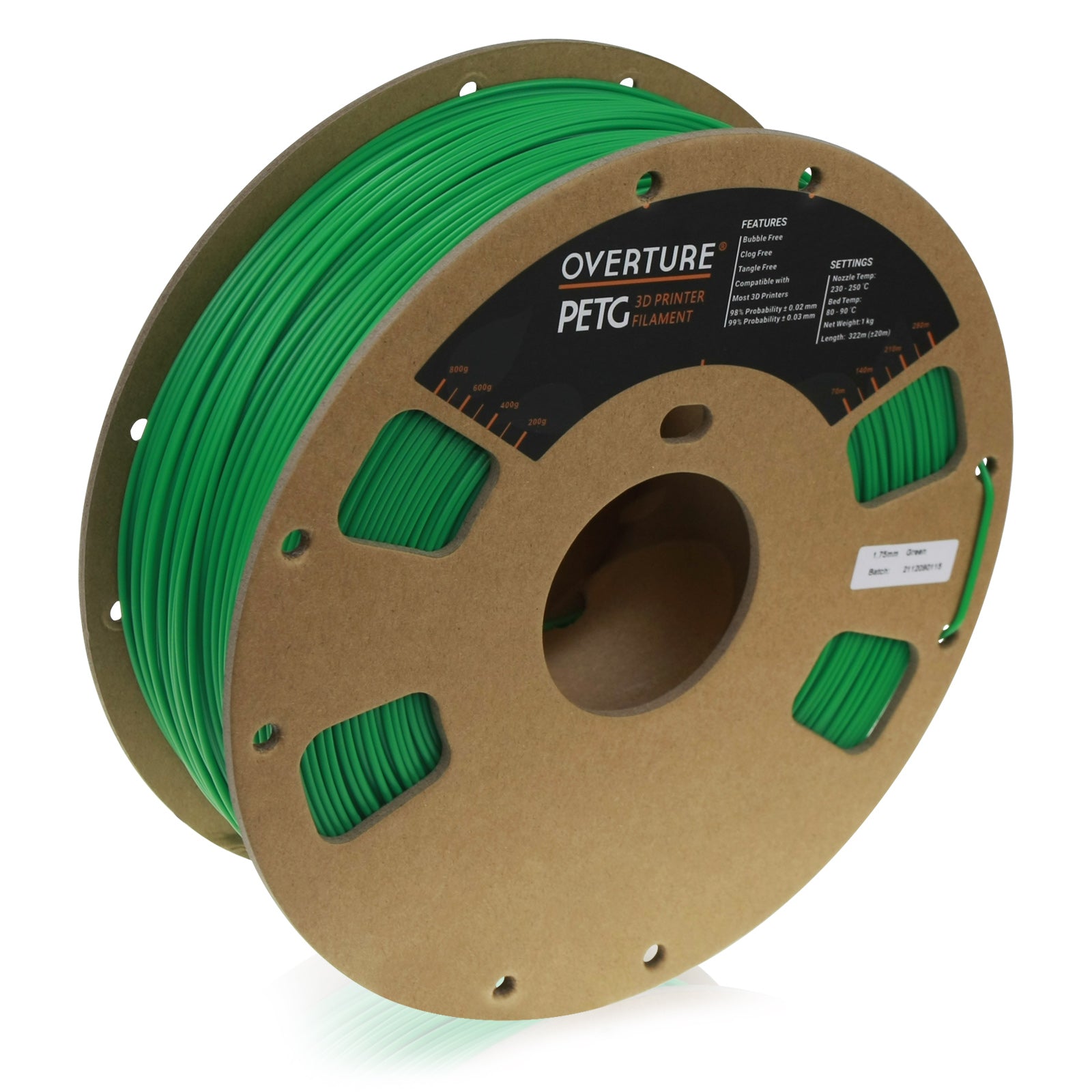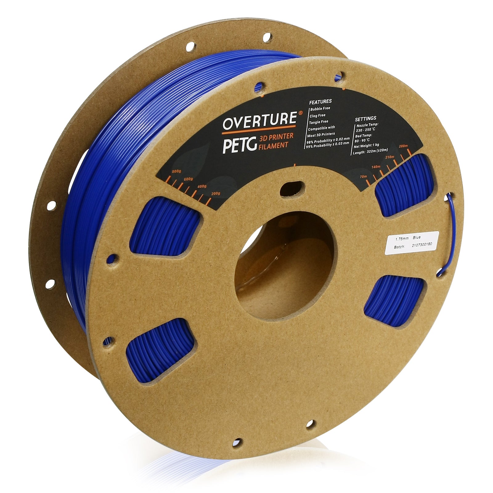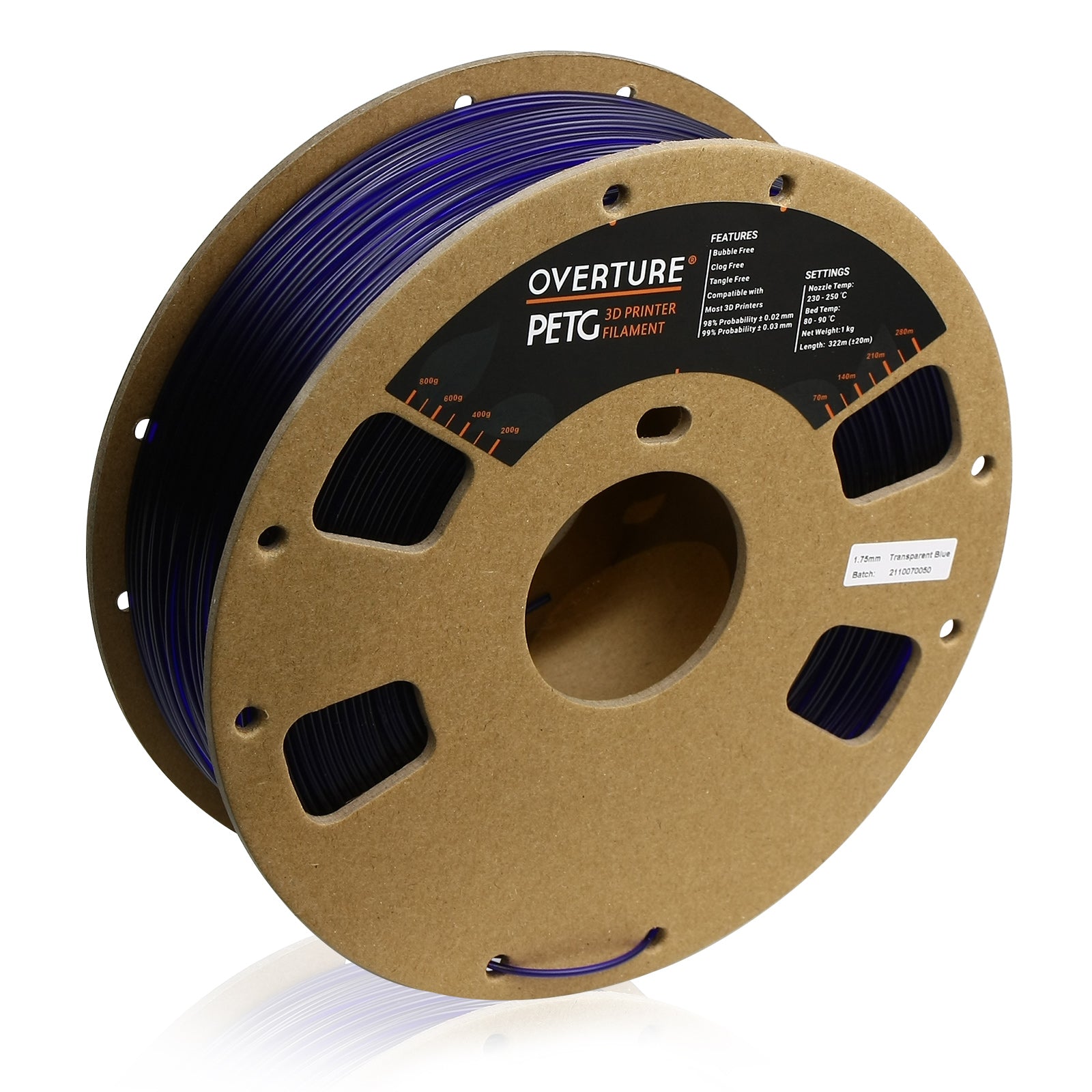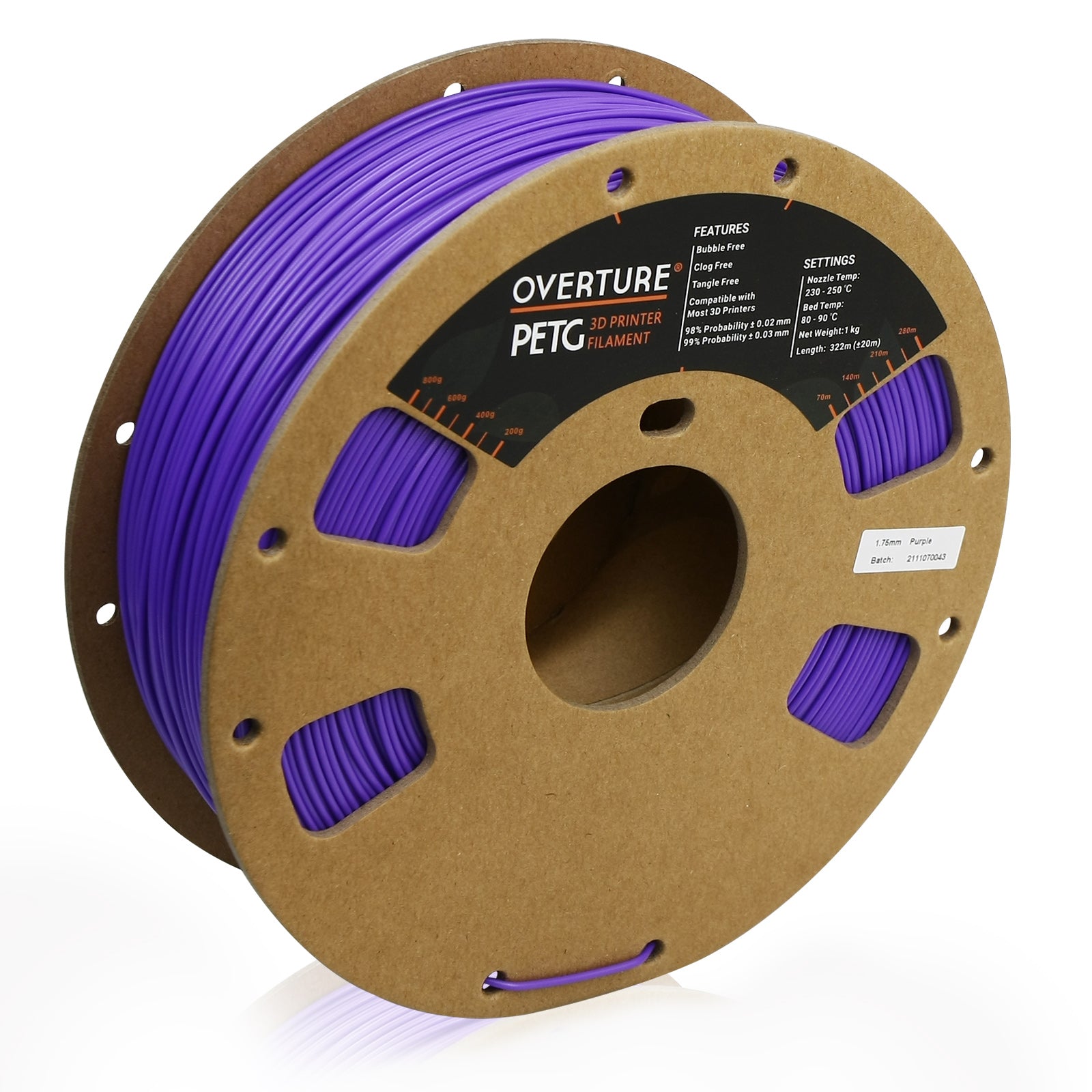 Overture PETG filaments are made of premium PETG resin which combines the advantages of PLA and ABS such as odorless, esay-to-print, little shrinkage rate; Outstanding toughness and high impact strength; Good liquidity (flows smoothly); High mechanical strength and excellent flexibility