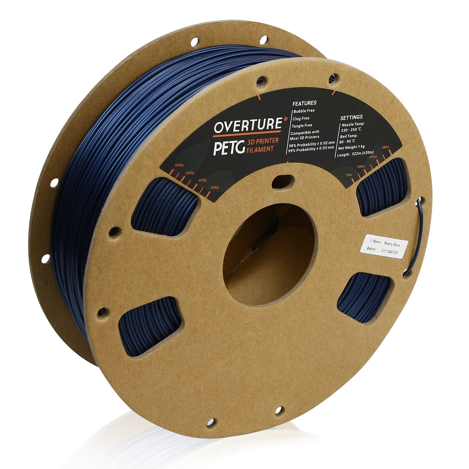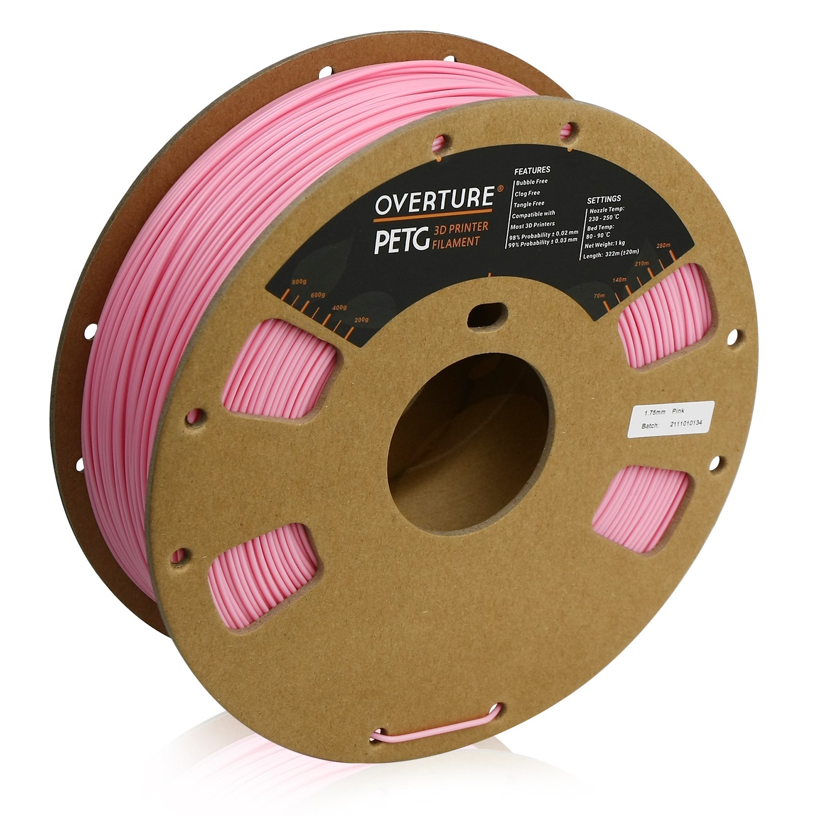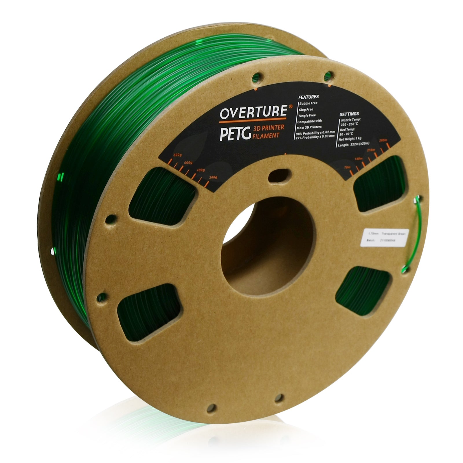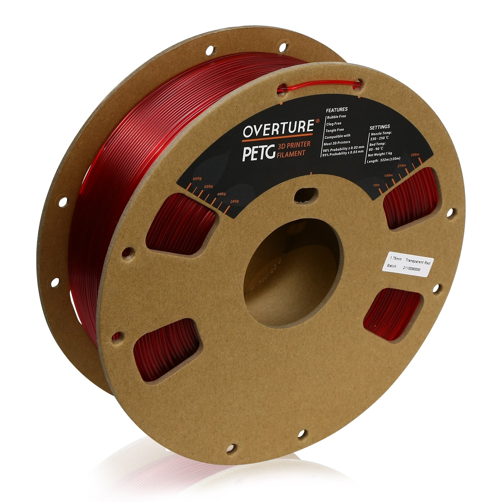 Overture PETG filaments are made of premium PETG resin which combines the advantages of PLA and ABS such as odorless, esay-to-print, little shrinkage rate; Outstanding toughness and high impact strength; Good liquidity (flows smoothly); High mechanical strength and excellent flexibility