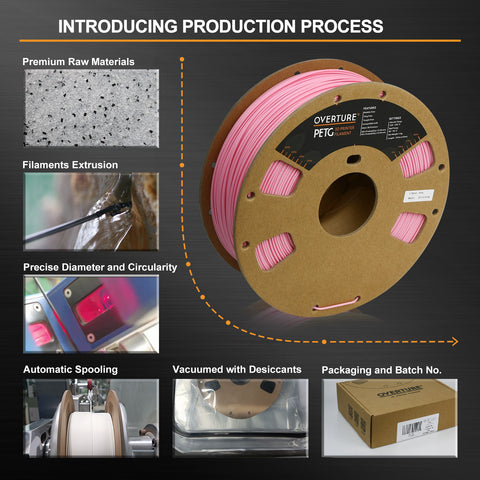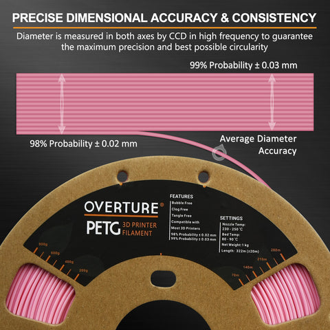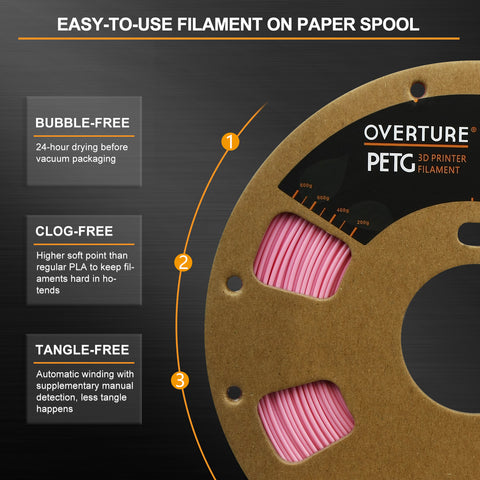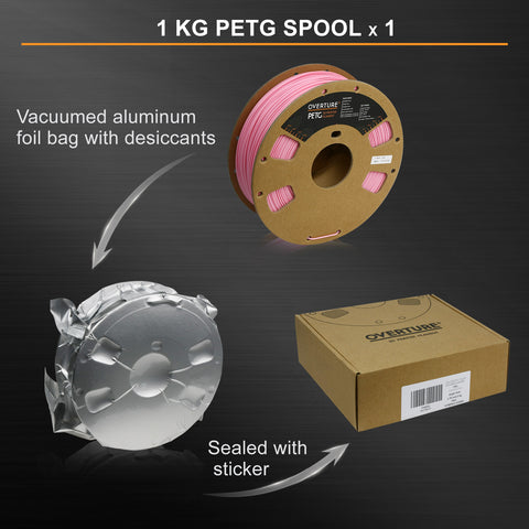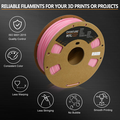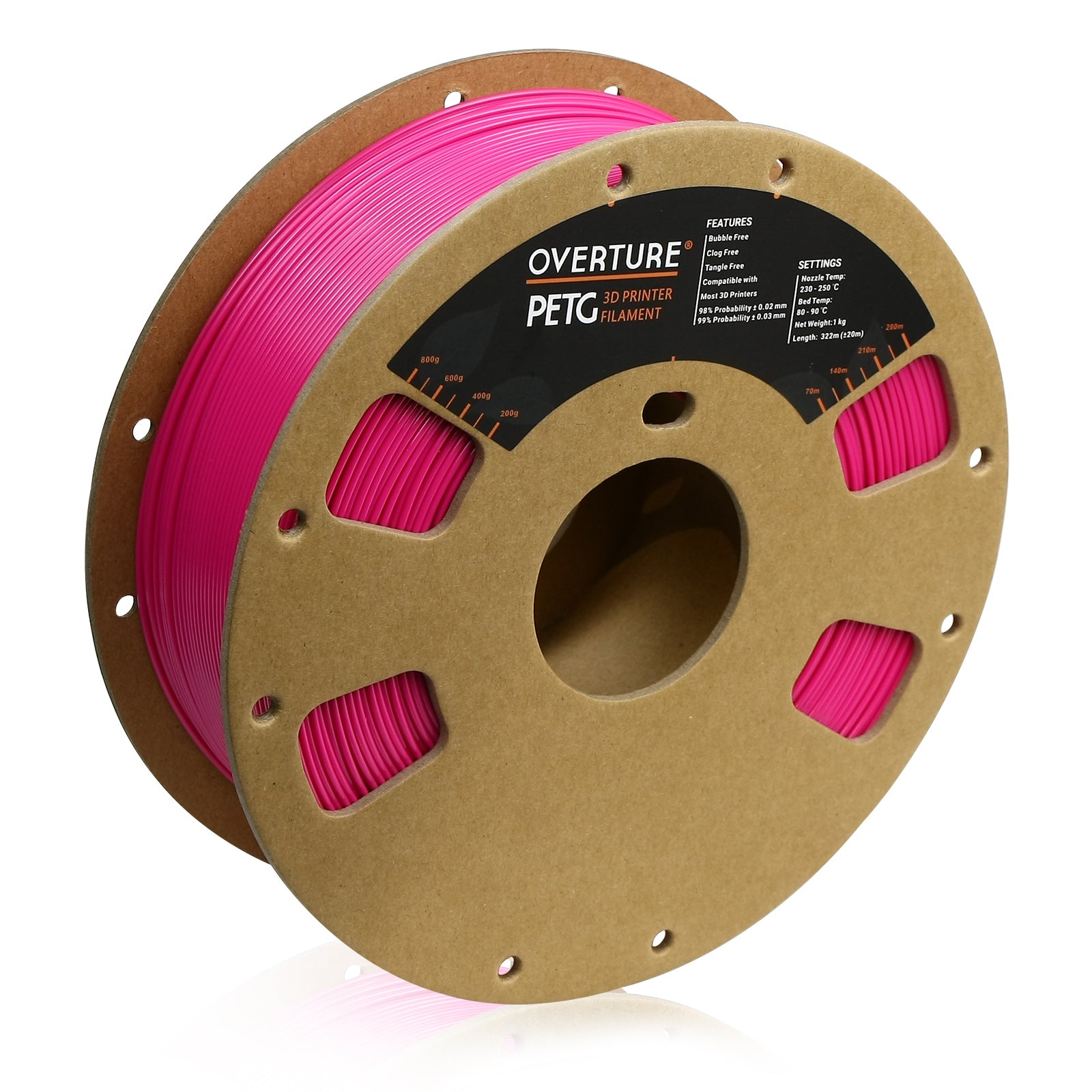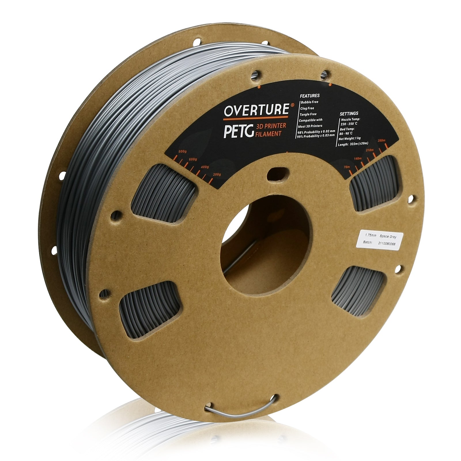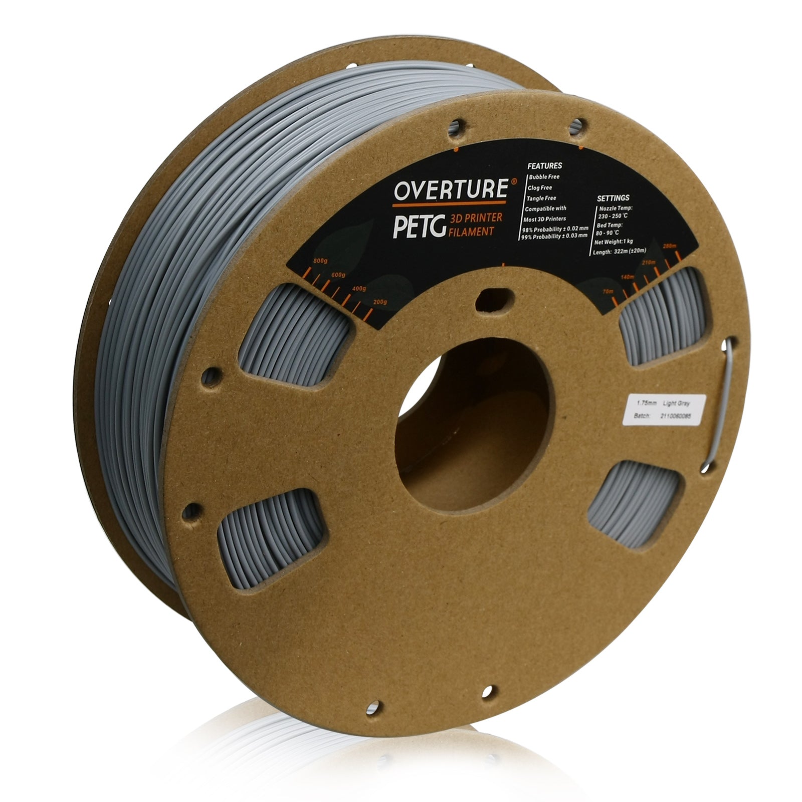 Overture PETG filaments are made of premium PETG resin which combines the advantages of PLA and ABS such as odorless, esay-to-print, little shrinkage rate; Outstanding toughness and high impact strength; Good liquidity (flows smoothly); High mechanical strength and excellent flexibility